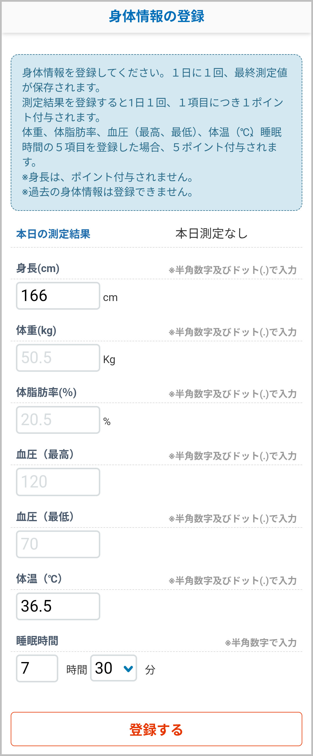 ③登録画面が表示されますので、身長・体重・血圧(最高/最低)・体温・睡眠時間を入力して、「登録する」をタップしてください。
